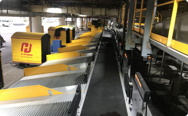 多类型自动分拣设备,包含行李出港转盘、低速行李分拣(双摆臂式/推杆式等)、中高速行李分拣(托盘式/交叉带式);独立装载系统或目的地编码车系统用于长距离高速输送分拣;进港行李输送及转盘。
